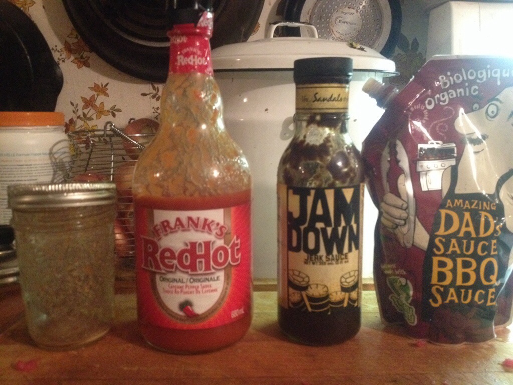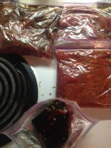 I split my cutlets into 4 piles that fit into sandwich ziplock bags. Then proceeded to fill with seasoning of my choice. This time I used the leftover teriyaki sauce my girlfriend gave me, franks red hot, a sandals jerk sauce and our fave BBQ sauce for the kiddos.