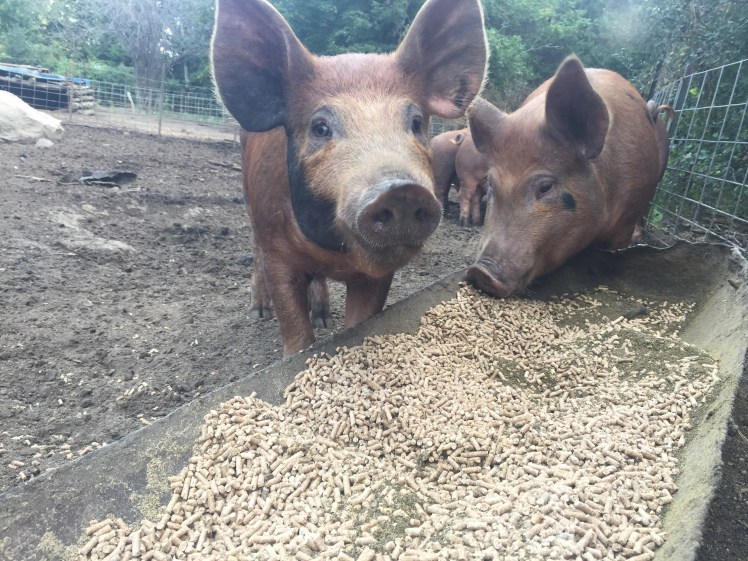 They are ruby red with coarse hair and a longer torso than the average pig which often leads to the being referred to as the ‘bacon’ pig. Their darker color hair allows them to enjoy the sun without getting sunburnt as some of the pink piggies may. Over all they are very hardy and great outdoor foraging pigs for us.